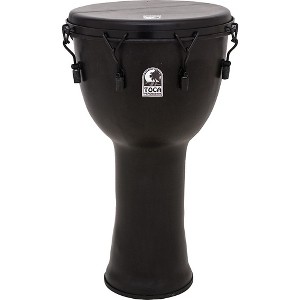 The Toca Fresstlyle Mechanically Tuned Djembe has a lightweight and durable seamless synthetic shell that sounds great and travels well. The djembe's low mass tuning system allows fast, accurate tuning that stays in place. Protective rubber bottom and tips on tuning lugs protect floor's finish. The drum's black finish with black hardware gives a striking look to go with its dynamic sounds, including an authentic goatskin head finished in black dye.
