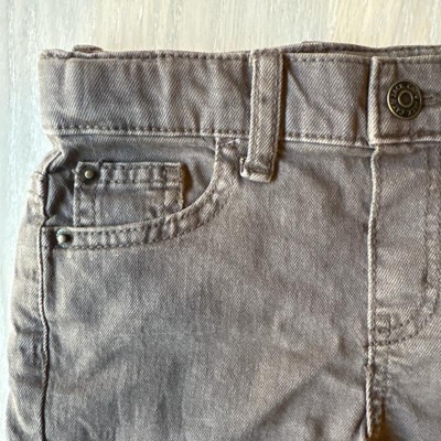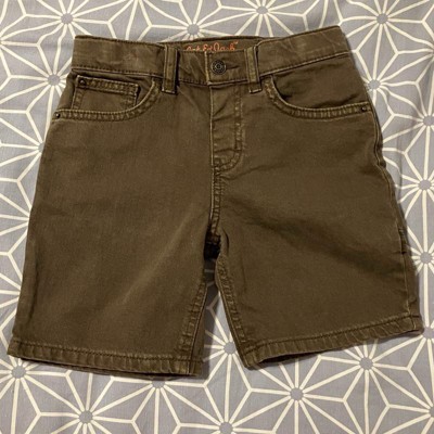 [This review was collected as part of a promotion.] These brown denim shorts have several great features in them beyond just basic shorts. They have the adjustable elastic-button band on both sides in the waistband (a huge help for my little guy) and they have pockets and a little bonus pocket on one side. The carpenter loop is not functional, which will keep it from snagging on things, but might disappoint a boy who knows to look for that feature. My son is 42 inches tall and about 38 pounds and I got him the 5T.