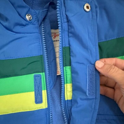 [This review was collected as part of a promotion.] I ordered a 2t in this puffer jacket for my 2 year old and it was a great fit. I loved the inside fleece to keep him warm in the cold months. There’s a zipper and Velcro to keep this jacket closed, always great with toddlers who manage to escape all their clothing! The color is really nice with bright stripes across the chest. There are pockets on each side that snap closed