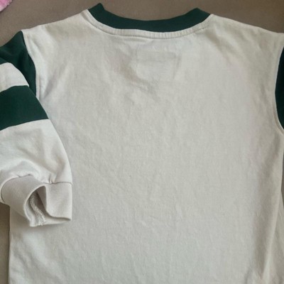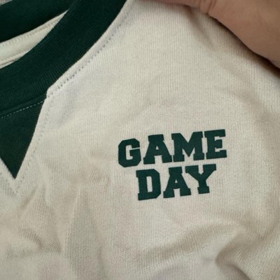 [This review was collected as part of a promotion.] I ordered a size 3t for my 2 year old in this long sleeve game day shirt and it is so adorable. The colors are really nice, the green is great for fall. The material of the shirt is thick and had a good stretch to it. The sleeves were slightly long but I did size up, a quick roll of the cuff and it was perfect! I’ve already washed it 2x and the colors didn’t bleed at all. Great shirt for the price!