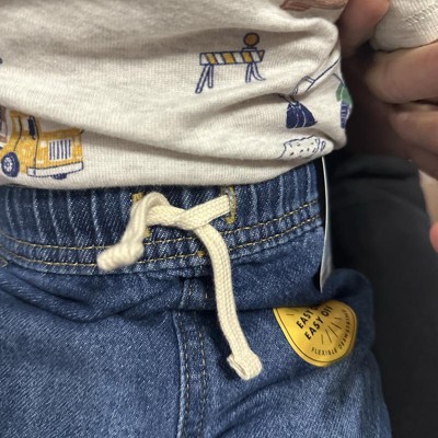 [This review was collected as part of a promotion.] These truly are easy on and easy off. These are a less structured jean shirt which works great for us while we potty train. My son is 20 months and wearing a size 3T which fits him just a bit loose, which is what we wanted. The shorts stay up, easy on and easy off, the drawstring is real for tightening up the shorts if needed. These are more flexible and a bit thinner than the other jean styles which makes them perfect for play. I received an incentive to write this review.