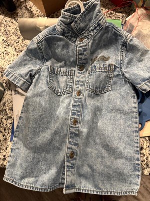 Upgrade your little one's wardrobe with this Short-Sleeve Embroidered Denim Button-Up Shirt from Cat & Jack™. Made from 100% cotton fabric, this short-sleeve button-down shirt offers all-day comfort. Designed with a collared neckline and a front button-down placket for easy wear and versatile styling, it features a denim-weave construction that pairs well with different shorts, cargo pants, skirts and more.