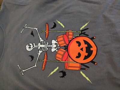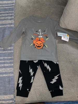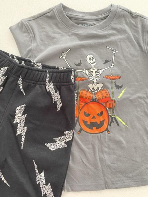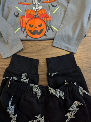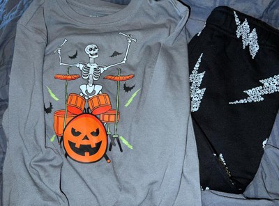 Add more excitement and fun to your toddler's Halloween celebration with the Skeleton Halloween Long-Sleeve T-Shirt and Jogger Pants Set from Cat & Jack™. This outfit set includes a long-sleeve T-shirt showcasing a skeleton playing drums and surrounded by bats for eerie appeal, and a pair of pull-on jogger pants with lightning and skulls to complement the look. Crafted from fleece fabric, this T-shirt and jogger pants set helps keep them warm and comfortable all day long.