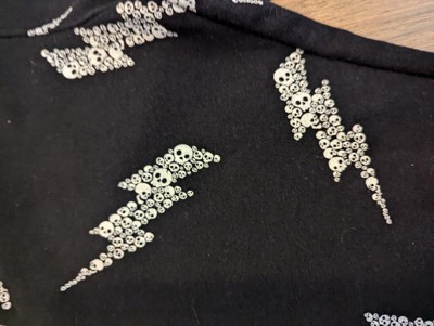 The set is adorable and perfect for the Halloween season or for someone who loves skeletons. The pants have multiple skulls together to make the lightning bolts and are soft inside to keep the legs warm. The outside feels like regular sweatpants. The shirt is a soft cotton blend with no cuffs on the sleeves.