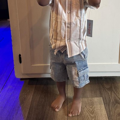 Make your little one's everyday wear extra comfortable with these Pull-On Denim Cargo Shorts from Cat & Jack™. The cargo shorts are crafted from cotton-spandex denim blend fabric for breathable comfort that moves with them on all their adventures. A flexible drawstring elastic waistband offers a secure and customizable fit, while two side, back and cargo pockets provide space to stash candy, gum or toys. Help them pair with tucked-in button-downs, polo shirts or tees.