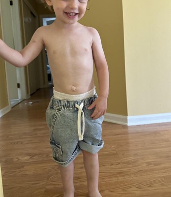 [This review was collected as part of a promotion.] I ordered these denim cargo shorts for my 4 year old who is pretty much wearing only 5T now because he is so tall. These were unfortunately just too big. I really had to cinch in the drawstring to make the shorts fit his waist, but I’m not sure the bow will actually hold all day long. The length of the shorts is also a bit too long. My son was not a fan of the shorts, so they’ll be returned. I received an incentive to write this review.
