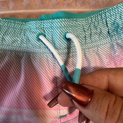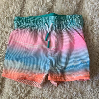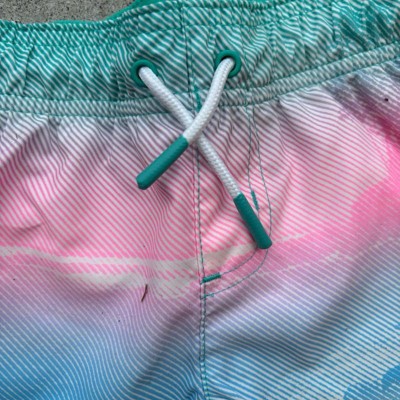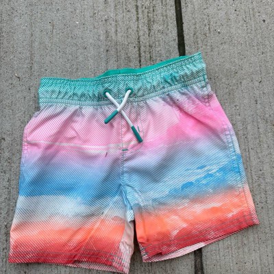 [This review was collected as part of a promotion.] I’m loving the colors on these swim shorts- reminds me of an amazing sunset over the ocean with shades of pink, orange, blue, and teal. This is a size 2T, which is my little boys normal size, and this fit him as I would expect. This suit is lined and has a tie at the waist that has a silicone type covering on the ends. I’m hopeful this suit will stay on his thinly built frame. I received an incentive to write this review.