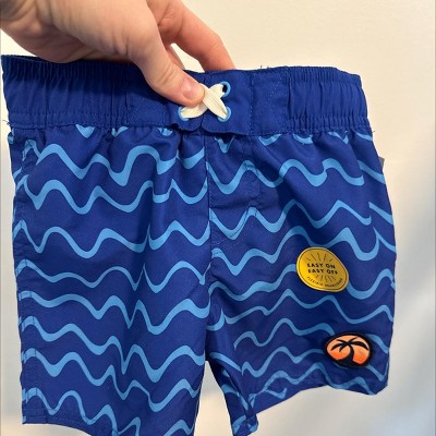 From playing on the beach to splashing in the pool, get your little one excited for sunny adventures in these Wave Swim Board Shorts With Patch from Cat & Jack™. These regular-rise swim shorts are made from 100% recycled polyester fabric and lined with built-in briefs for comfortable wear in or out of water. The UPF 50+ rated material offers protection from harmful sun rays, while the full elastic waistband helps them find a snug fit. Featuring allover wave print in blue on a navy background, these swim shorts make a fun pairing with other swimwear. Plus, a circular patch showcasing a palm tree silhouette and shore adds a vibrant, summery touch.