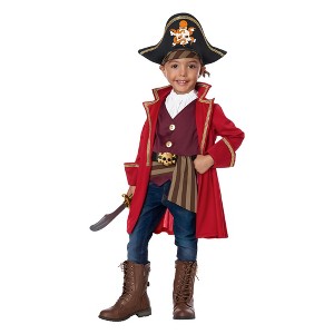 Is your child ready to fill their boots and embark on an exciting, yet dangerous adventure? It's time for them to buckle up, board the ship and set sail wearing our Toddler Pirate Cap N Shorty Costume. They'll join other crew members on a quest to find the treasure chest! It's a great costume choice for a pirate themed party or a Disney party with their toddler friends. The Toddler Pirate Cap N Short Costume comes complete with a long sleeved, red jacket with gold trim, a pull over red vest with gold button detailing and a waist sash. It also includes a white cravat that ties around the neck, a gold and dark red bandana, and a large black and gold trimmed pirates hat. Who's scrubbing the decks today?
