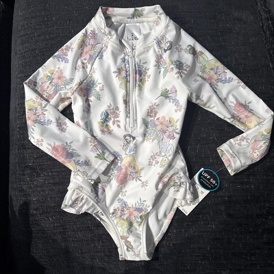 Let your little one splash and play in style with this Toddler Girls' Disney Princess Long Sleeve Half Zip One Piece Rash Guard Swimsuit- Ivory. Featuring long sleeves and a comfy half-zip front, this suit keeps her covered while she swims and plays. The soft ivory color and fun princess print bring magic to pool days and beach adventures. It’s designed for easy movement and all-day comfort in and out of the water.
