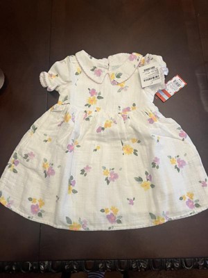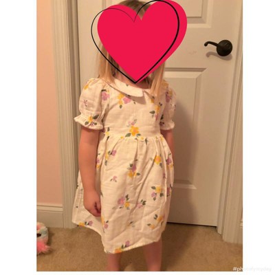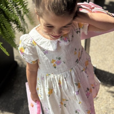 Prepare their wardrobe for warmer days with this Floral Dress from Cat & Jack™. This knee-length dress is made from 100% cotton for all-day comfort and features allover floral prints for a playful look. Designed in a Peter Pan collar neckline with a back keyhole, this dress with puff ruffled sleeves is easy to wear. Plus, it has two side pockets to stash their everyday essentials.