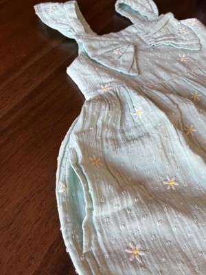 This dress is so cute. I like the light green color for spring and summer. The little embroidered daises are so precious, as is the large bow detail on the front. This could be worn alone, but I think it would be cute with a short or long sleeve shirt/onesie underneath.