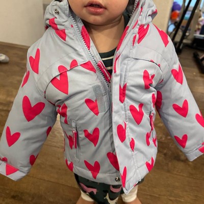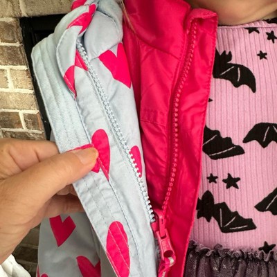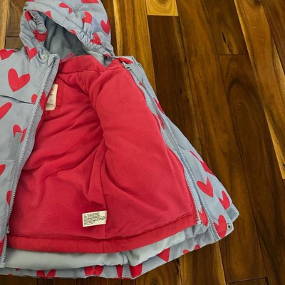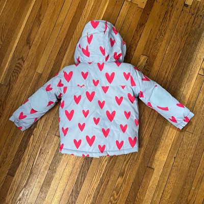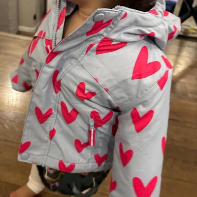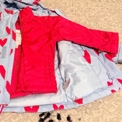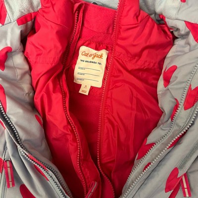 Keep your toddler's closet winter ready with the 3-in-1 Snowplay Jacket from Cat & Jack™. This woven 3-in-1 jacket features adjustable, banded cuffs for complete coverage and comes with side pockets to help stash away mittens, gloves and other items. Made from 100% recycled polyester fabric, this midweight jacket is designed in light blue with hearts print with a solid light pink vest underneath, and the front full-length zipper allows for easy wear and layering.