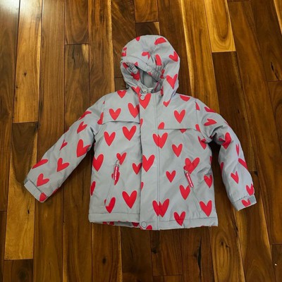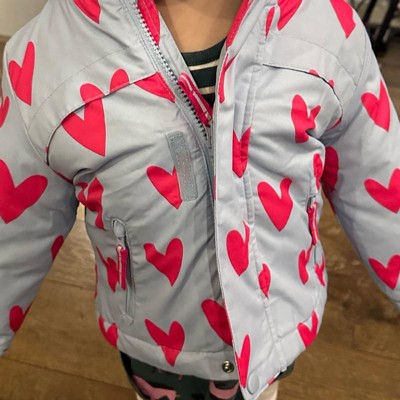 [This review was collected as part of a promotion.] This is an adorable winter jacket for children! My daughter is five and a half years old and the size 5T fit her true to size. The cute bright pink hearts made her instantly love this jacket! It is so warm and fleece lined. The outer jacket unzips from the inner jacket and detaches so that you can also just use the inner jacket in the fall and spring. The bright colors make it easy to see your kids at parks and other public places.