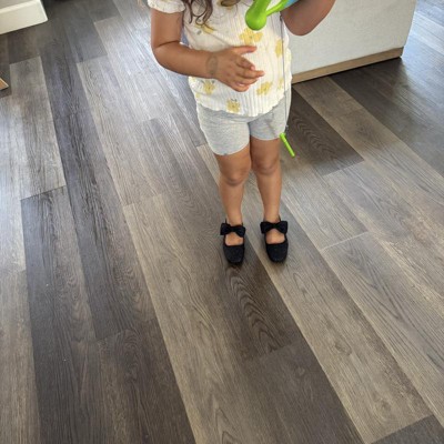 Add a cute staple to your little ballerina's shoe closet with these Juni Bow Ballet Flats from Cat & Jack™. These ballet flats feature an allover sparkly design and a decorative bow on the strap for a trendy look. Designed with a closed square toe, these medium-width ballet flats have an adjustable hook-and-loop strap for a snug, customizable fit. They can wear them with a tulle dress for an adorable look on both casual and dressy occasions.