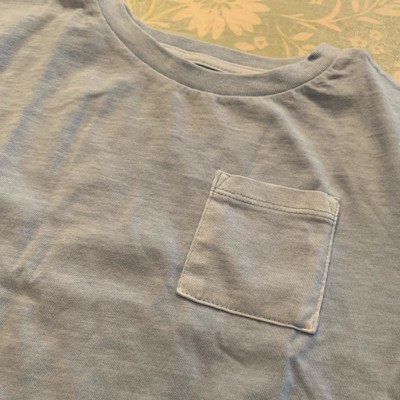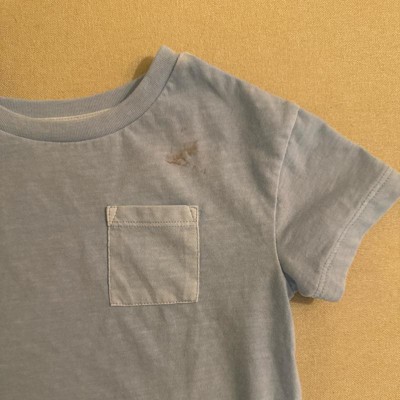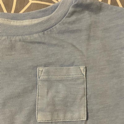 [This review was collected as part of a promotion.] My kid is 34 inches and 34 lbs and wearing a 3t. This shirt is soft and has a sun faded look from the start. We did get a berry stain on it but that happen with kiddos. I like the color so much I might buy a second, berry-stain-free shirt. The color isn’t solid, it’s subtly faded around the edges and collar. Definitely a casual, salty beach vibe. The pocket is pretty small but will hold a couple of “special rocks” if your kid is into that kind of thing. Despite the berry stain, the rest of the shirt has washed well without any shrinkage.