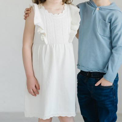 This Sweater Ruffle Dress from Cat & Jack™ makes a delightful addition to your toddler's closet for when the weather gets cooler. Made from cotton-recycled polyester blend fabric, this sleeveless dress provides all-day comfort. Featuring scalloped detailing on the neck and hem, this sweater dress also has pointelle fabric on the bodice for a sweet look. Plus, this knee-length dress has a ruffled front and back for extra flair. They can pair it with their favorite shoes and accessories to complete the adorable ensemble.