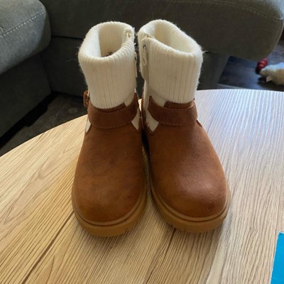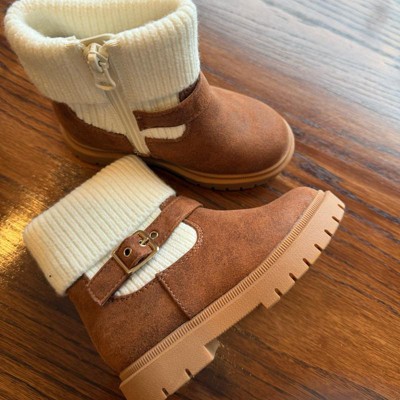 [This review was collected as part of a promotion.] My daughter is a tall 3 year old and I bought her the size 12T in these boots. They are a bit big now, but with thick socks, she will grow into them. I love the look of suede and sweater cuffs. The faux suede material does look a bit cheap up close, but the cuffs help to even that out. The overall details look expensive together. They have a side zipper, so my daughter can get in and out easily. I can’t wait for her to wear these with fall dresses. I received an incentive to write this review.