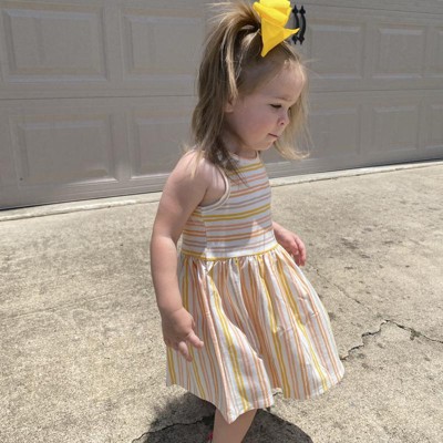 Your tiny tot will love to dress in this Warm Striped Tank Dress from Cat & Jack™. The tank dress is made from soft, breathable cotton-blend fabric and makes a comfortable everyday outfit. This sleeveless tank dress in knee-length sports a casual crewneck, soft gathers on the waist, and an allover striped pattern for a cool look. You can have them pair it with their favorite shoes and accessories for a cute look.