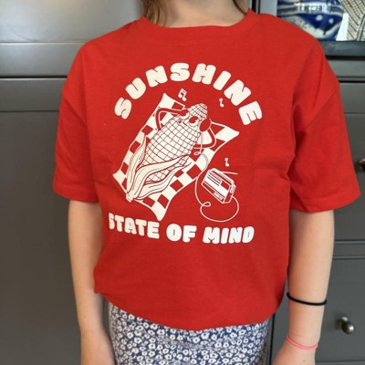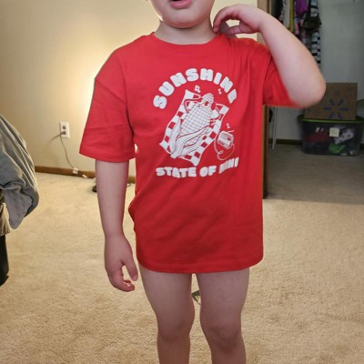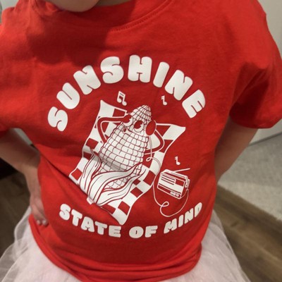 [This review was collected as part of a promotion.] Super cute “sunshine state of mind” tee shirt! Very vibrant red color with cute retro corn graphic. Will be a super great shirt for summer festivities and very easy wearable graphic tee. The 5t fit is true to size and what you would expect. Easy cotton-blend fabric for a hot summer day. Would definitely buy another one of these for my other children this summer or next. I received an incentive to write this review.