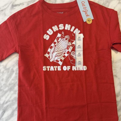 [This review was collected as part of a promotion.] Cute, good quality Graphic Tshirt from Cat and Jack. Has a summer feel to it with the "Sunshine State of Mind" corn picture on it. My 4 year old is wearing a size 5T and it fits true to size. He usually wears an extra small or a size 5T. This shirt was long enough and length and big enough so it wasn't tight on him. Seems well made and a good price for the quality of shirt. Perfect for everyday wear I received an incentive to write this review.