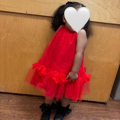 Love that the bottom part of the dress was actually poofy as soon as it was on. Super cute and loving the color for the holidays and Valentin’s day. I got my 2yo a size 3t.