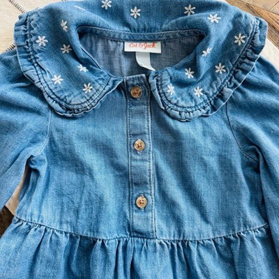 Make their casual outings or playdates more fun with the Denim Dress from Cat & Jack™. This medium wash dress features a collared neckline with floral embroidery to sweeten up the look. It's front half-length buttons allow easy dressing and changing. Made of 100% cotton fabric, this at-knee length dress offers soft and breathable comfort.