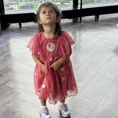 Let your little one sparkle in the Toddler Girls' Disney Princess Metallic Shine Short Sleeve Tulle Dress in Pink. This enchanting midi-length dress features shimmering metallic details and a soft tulle overlay that brings fairytale magic to life. Designed with delicate mini cap sleeves and a round neckline, it offers a sweet and graceful silhouette fit for any little princess. Crafted from lightweight poplin and tulle fabrics, it's as comfortable as it is charming, making it perfect for birthday parties, dress-up days or twirling on her way out.