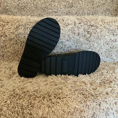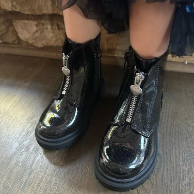 Upgrade your toddler's shoe collection with these Donna Chelsea Boots from Cat & Jack™. These closed-toe boots have a faux-patent upper in a versatile black shade with a speckled finish that adds a hint of shine to their steps. Set on a textured outsole and cushioned insole, these medium-width boots are finished with a silver-tone zippered fastening down the front accented with a heart-shaped pull as well as a side zipper for comfortable wear and a standout look