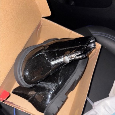 [This review was collected as part of a promotion.] These little black boots are featured in a size 11 which is the size that my child currently fits into. The boots are unique in that the front zippers (silver) on them and side zippers (black) both unzip and zip to allow for ease of getting them on and off. We had no issues with on and off because of this and my child was able to do it all on her own. These are really cute and have good treads on the bottom. I think your little one will like them too!
