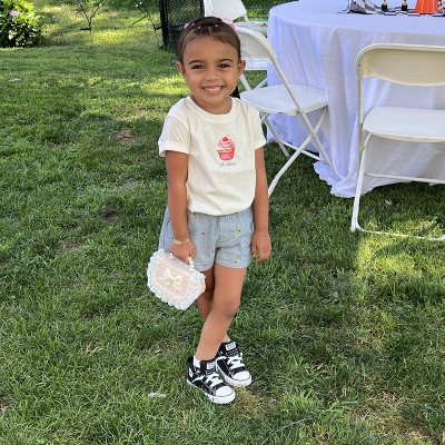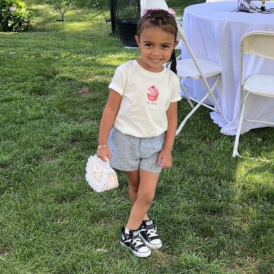 [This review was collected as part of a promotion.] We love the Cat & Jack brand so much for toddler clothes. When I saw these cute floral embroidered jean shorts I knew my daughter would love them. She is almost two and fits in a 2T well. These fit true to size. My only complaint is that they are not as soft as most of the toddler shorts since they are more of a Jean material. But they are still stretchy and the pockets on the back are so adorable. The pink and yellow flowers are a cute detail too. I received an incentive to write this review.