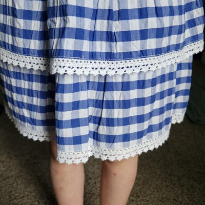 • A: The skirt features a gingham pattern with a tiered design and lace trims for added style.