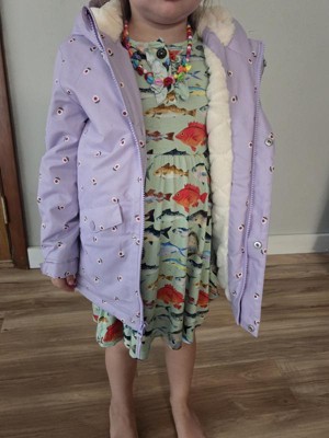 Keep them warm and cozy in this Hooded Parka Jacket from Cat & Jack™. Made of 100% recycled polyester fabric with faux-fur lining, this long-sleeve jacket features allover floral prints that add fun, whimsical flair to their outfit, while the attached hood provides extra coverage. It boasts a front full-length zipper for easy on and off, along with a snap storm placket that helps keep out wind. Tailored in a casual fit, this parka jacket is also resistant to wind and water, making it a great pick for inclement weather.