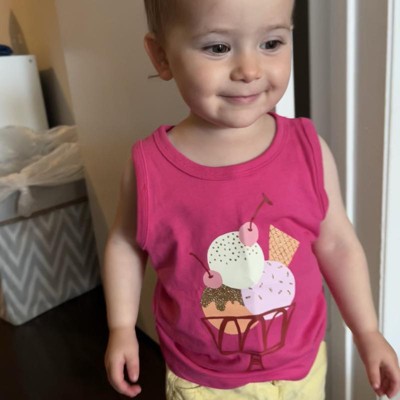 [This review was collected as part of a promotion.] I sized up to 18 months for this cute ice cream tank top for my daughter but it still looks adorable on her now! The ice cream design is adorable and girly! The sizing is accurate and consistent with this brand. I love the bright pink. The fabric is soft and durable. The only issue is that the specific tank that I recieved did come with a lose thread, which I was able to cut and no one would ever know! I received an incentive to write this review.