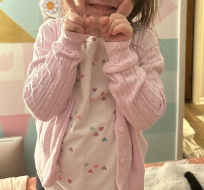 This pink cardigan is sooo cute! It’s not a winter cardigan due to the lace holes in it but it’s a perfect spring cardigan. It’s very versatile to style and stretchy. This sweater is very soft and my toddler loves it.