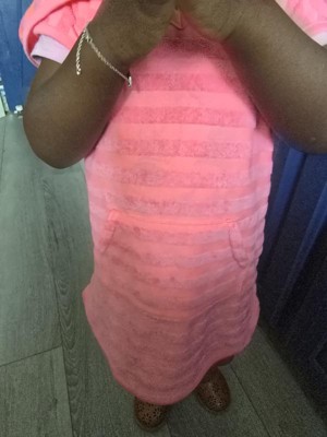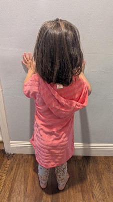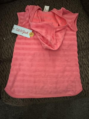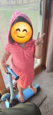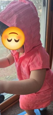 Super cute pink terry swimsuit cover up for a toddler girl. It is very soft and the qualify seems great. It also has a hood for a little extra warmth. It is perfect for a day at the beach or pool. The bright pink color screams Summer!