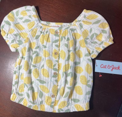 Refresh your kid's summer wardrobe with this Top from Cat & Jack™. Made from 100% cotton for all-day comfort, this solid-color top features scalloped trim and buttons down the front. Designed with a square neckline, this regular-fit top also has short puff sleeves for extra flair. You can have them pair it with a skirt or shorts for a fun and comfy look.