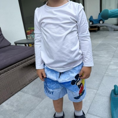 This white full-sleeve swim top is perfect for active boys who love the water. The fabric is lightweight, quick-drying, and provides excellent sun protection — ideal for long days at the beach or pool. The fit is snug but stretchy. the white color keeps it cool in the sun. Overall, a great choice for comfort, coverage, and protection.