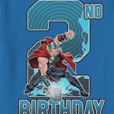 No villain will stand a chance on your special day if you are wearing your favorite comic book heroes as you party with your friends and family in style! This officially licensed Marvel 2nd Birthday Thor Toddlers' Blue Graphic T-Shirt features a graphic of Thor, the god of thunder, along with the text: "2nd Birthday." Grab one of these amazing Marvel shirts and start celebrating your party, superhero style!
