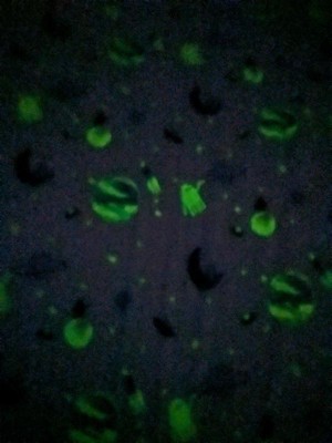 These sheets aren't labeled as glow in the dark, so these surprised us one night. They don't glow much under regular light, but if you want them to glow brightly, use a purple light!