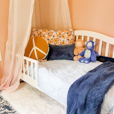 I thought it was a bit more pastel online than in person, but it was a huge hit for the big girl bed! We chose a navy blue comforter. We are doing the walls light blue and buying the yellow flower shelf, and peace sign lamp and putting up a few 60’s and 70’s rock posters for a groovy vibe! So cute. Sheets soften after the first wash by the way!