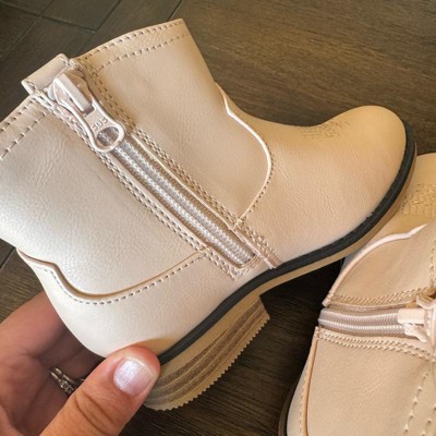 Add a little floral Western style to your toddler's outfit with these Whitley Embroidered Western Boots from Cat & Jack™. These ankle boots boast a faux-leather upper, round toe, and soft insole and lining. Set on a 1/4-inch heel, the solid-color boots have ornate stitching on the vamp and shaft. A side zipper and stylish pull loop complete the look and offer easy on and off.