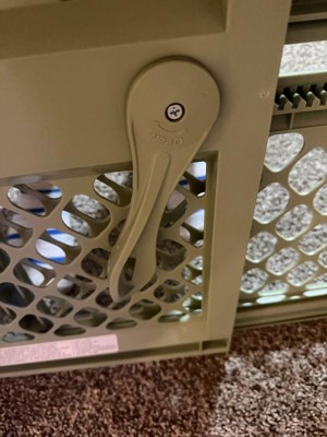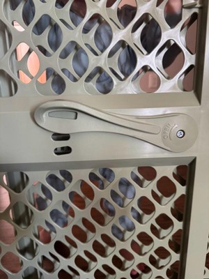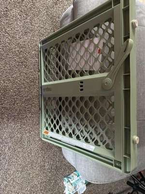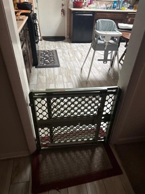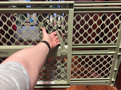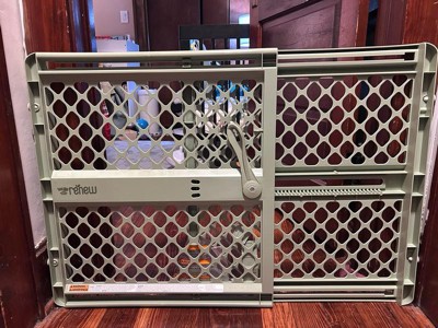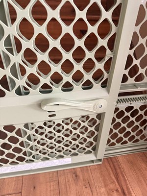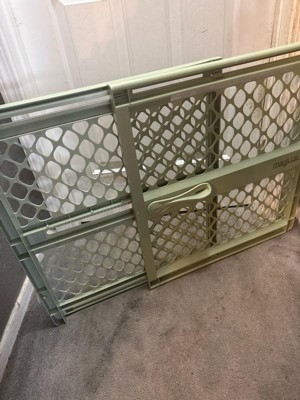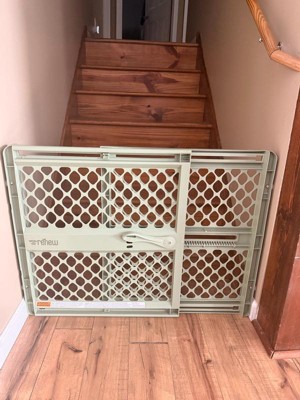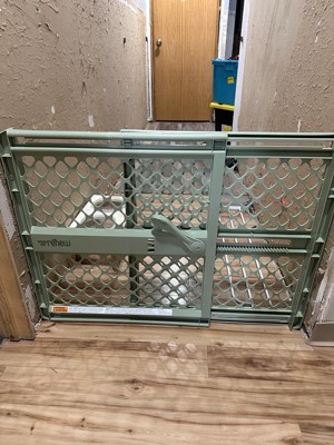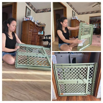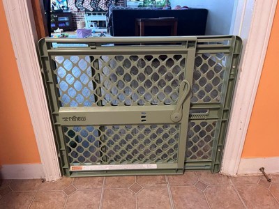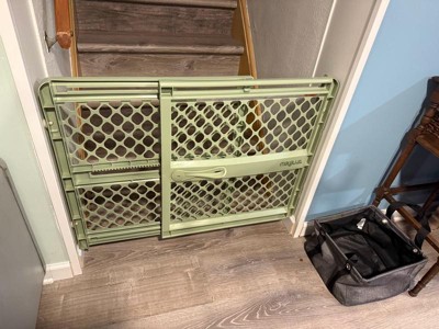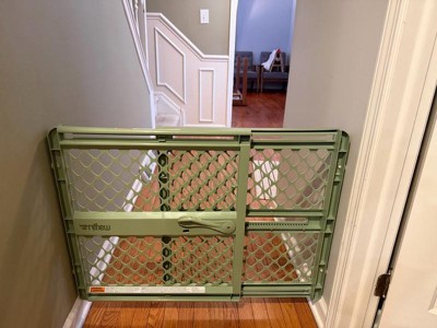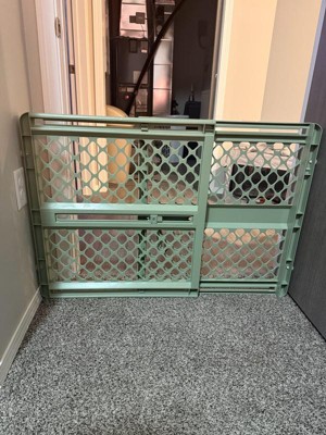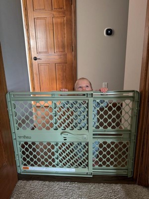 [This review was collected as part of a promotion.] This gate is super easy to use compared to the old style of baby gate. You just slide it out to be about the size of the door frame and then use the lever to create the correct amount of tension. The Sea Grass Green is the perfect color. I really like this gate and would recommend it to anyone looking for a simple, cute baby gate.