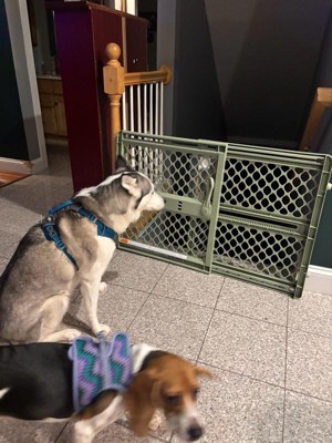 [This review was collected as part of a promotion.] I really like this gate. We have a 100lb dog and didn’t think it would contain him but it does. He could easily walk over it but he knows not to. It’s easy to install and can easily be moved. It came in a slim box package and it’s easy to maintain.