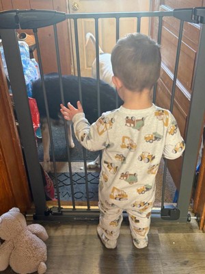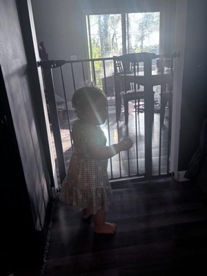 [This review was collected as part of a promotion.] The gate comes with multiple accessories to allow you to fit it to multiple doorways and frames. It’s very durable and sturdy and the graphite color makes it very sleek. It secures tightly to the wall to prevent children and pets from being able to push through. It also has locks at the bottom and requires several actions on the handle to open it and keep toddlers from opening it. The instructions are clear if you read them. Don’t try to just look at the pictures without reading the instructions as you’ll miss some steps. Getting it installed solo was a little difficult and took longer than I wanted it too. You need a few tools to get it all together and adjusted. Overall it’s a nice design and sturdy gate. I really like that I can use it in multiple places at my home with all of the adjustments.