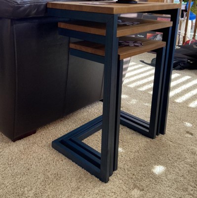table idea is good and price was ok ...but the larger table has an additional cross piece (the photo here does not reveal one) at the bottom that prevents the three from nesting as shown. The wood is rough and has areas that are unstained. The metal is poorly welded. Taking them back.