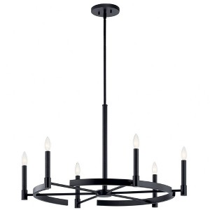 Modern elegance is simple. The Tolani 6 light chandelier embodies this truth with its delicately ribbed center column and simple gaps in the wagon wheel. It elevates the familiar to the modern, as its Black finish illuminates without exaggeration. Material: Steel, Finish Color: Black, Width: 34", Height: 20", Lamping Type: Incandescent, Number Of Bulbs: 6, Wattage: 60 Watts, Dimmable: Yes, Moisture Rating: Dry Rated