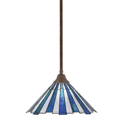Collection: Any, Material: Steel, Finish Color: Bronze, Width: 14", Height: 11.5", Chain Length: 120", Lamping Type: Incandescent, Number Of Bulbs: 1, Wattage: 150 Watts, Dimmable: No, Moisture Rating: Dry Rated Desc: Chain Hung Pendant With Square Fitter Shown In Black Copper Finish With 14" Sante Fe Art Glass, Material: Steel, Finish Color: Bronze, Width: 14", Height: 11.5", Chain Length: 120", Lamping Type: Incandescent, Number Of Bulbs: 1, Wattage: 150 Watts, Dimmable: No, Moisture Rating: Dry Rated-Any - 1 Light Chain Hung Pendant-11.5 Inches Tall and 14 Inches Wide-Bronze Finish-Purple/Metal Leaf Art Glass Color -Traditional Installation