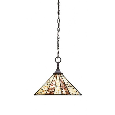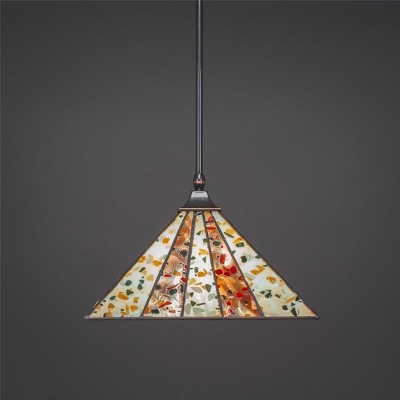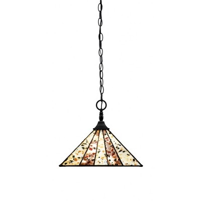 Collection: Any, Material: Steel, Finish Color: Matte Black, Width: 14", Height: 11.5", Chain Length: 84", Lamping Type: Incandescent, Number Of Bulbs: 1, Wattage: 150 Watts, Dimmable: No, Moisture Rating: Dry Rated Desc: Stem Hung Pendant With Square Fitter Shown In Black Copper Finish With 14" Santa Fe Art Glass, Material: Steel, Finish Color: Matte Black, Width: 14", Height: 11.5", Chain Length: 84", Lamping Type: Incandescent, Number Of Bulbs: 1, Wattage: 150 Watts, Dimmable: No, Moisture Rating: Dry Rated-Any - 1 Light Stem Hung Stem Hung Pendant-11.5 Inches Tall and 14 Inches Wide-Matte Black Finish-Fiesta Art Glass Color