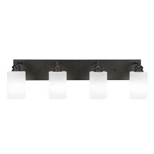 Collection: Edge, Material: Steel, Finish Color: Espresso, Height: 8.5", Length: 31", Depth: 6.25", Backplate Width: 30", Backplate Length: 5", Lamping Type: Incandescent, Number Of Bulbs: 4, Wattage: 60 Watts, Dimmable: No, Moisture Rating: Damp Rated Desc: Edge 4 Light Bath Bar Shown In Espresso Finish With 4� White Muslin Glass, Material: Steel, Finish Color: Espresso, Height: 8.5", Length: 31", Depth: 6.25", Backplate Width: 30", Backplate Length: 5", Lamping Type: Incandescent, Number Of Bulbs: 4, Wattage: 60 Watts, Dimmable: No, Moisture Rating: Damp Rated-Edge - 4 Light Bath Bar-8.5 Inches Tall and Inches Wide-Espresso Finish-White Matrix Glass Color